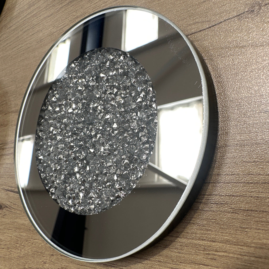 Add a touch of glamour to your table with this set of crystal-embedded glass coasters. One features a round design with a shimmering centre, while the other boasts a striking square shape with a sparkling border. Both coasters are crafted from durable glass and decorated with glittering crushed crystals that catch the light beautifully. Perfect for protecting surfaces while elevating your décor, they blend function with luxury in any setting.