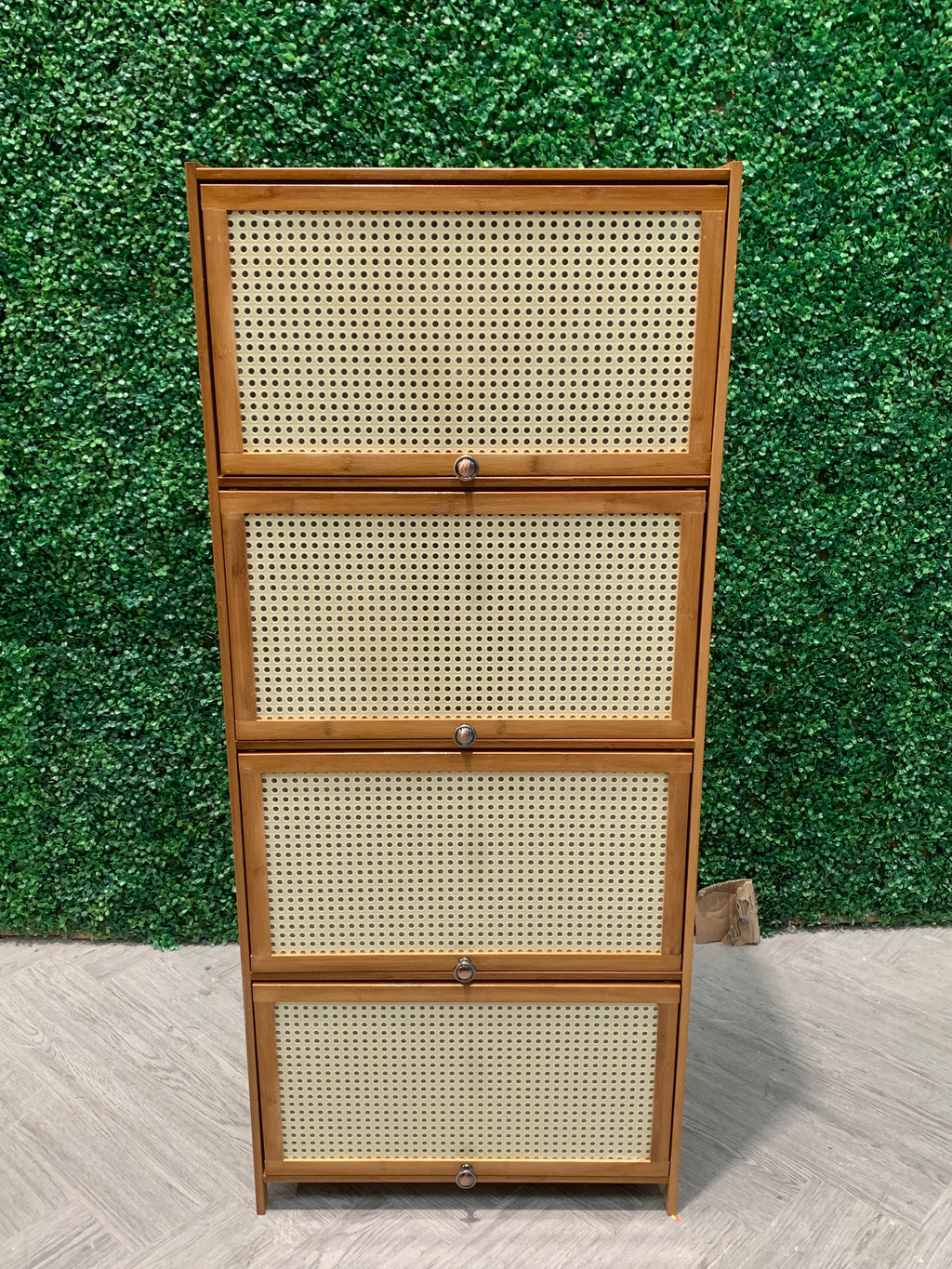 This stylish storage cabinet is crafted from natural bamboo and features woven rattan-effect doors that add a touch of rustic charm to your home. With four spacious compartments, it provides plenty of room to organise shoes, books, or daily essentials neatly. The breathable rattan-style panels not only enhance the design but also allow air circulation, keeping stored items fresh. Compact yet practical, this cabinet is ideal for hallways, bedrooms, or living rooms.