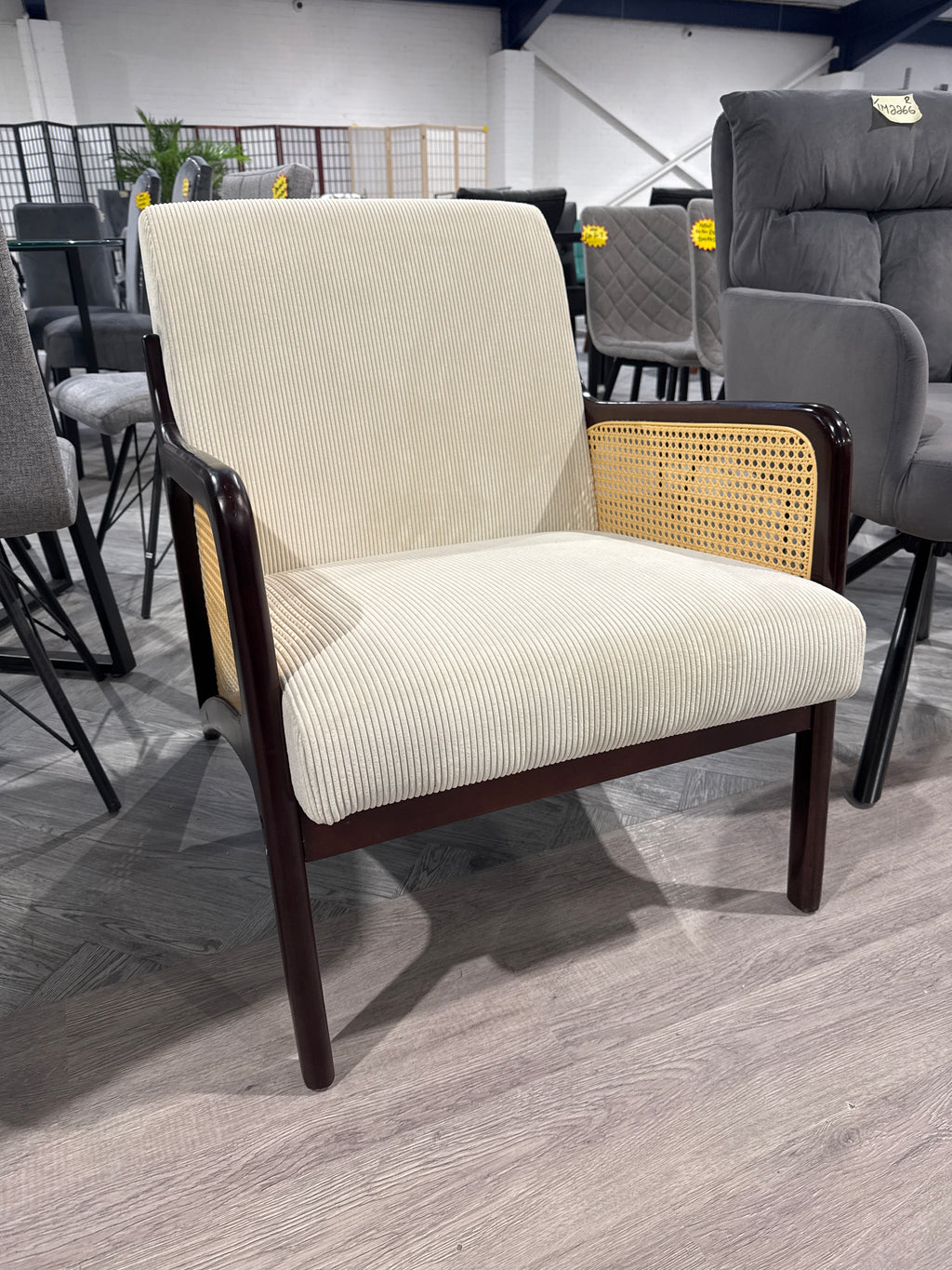 Perfect for reading or relaxing, this armchair offers exceptional comfort for your downtime. The luxurious corduroy fabric adds a classy touch, while rubberwood legs ensure sturdy support. Unique rattan detailing on the armrests enhances its charm, making it a stylish addition to any space.