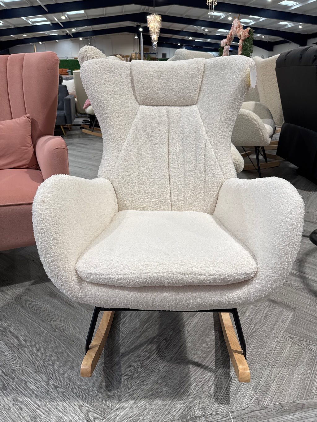 Unwind in comfort with this beautifully designed rocking chair. Upholstered in soft white lambswool fabric, it feels warm and snug to the touch. The smooth rocking motion and wide backrest make it perfect for moments of relaxation. With a sleek black metal frame and wooden runners, it brings both comfort and style to your home.