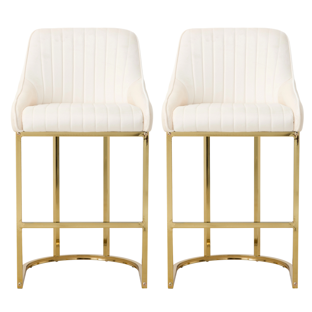 New Set of 2 Upholstered Bar Stools White Velvet with Gold Metal Base