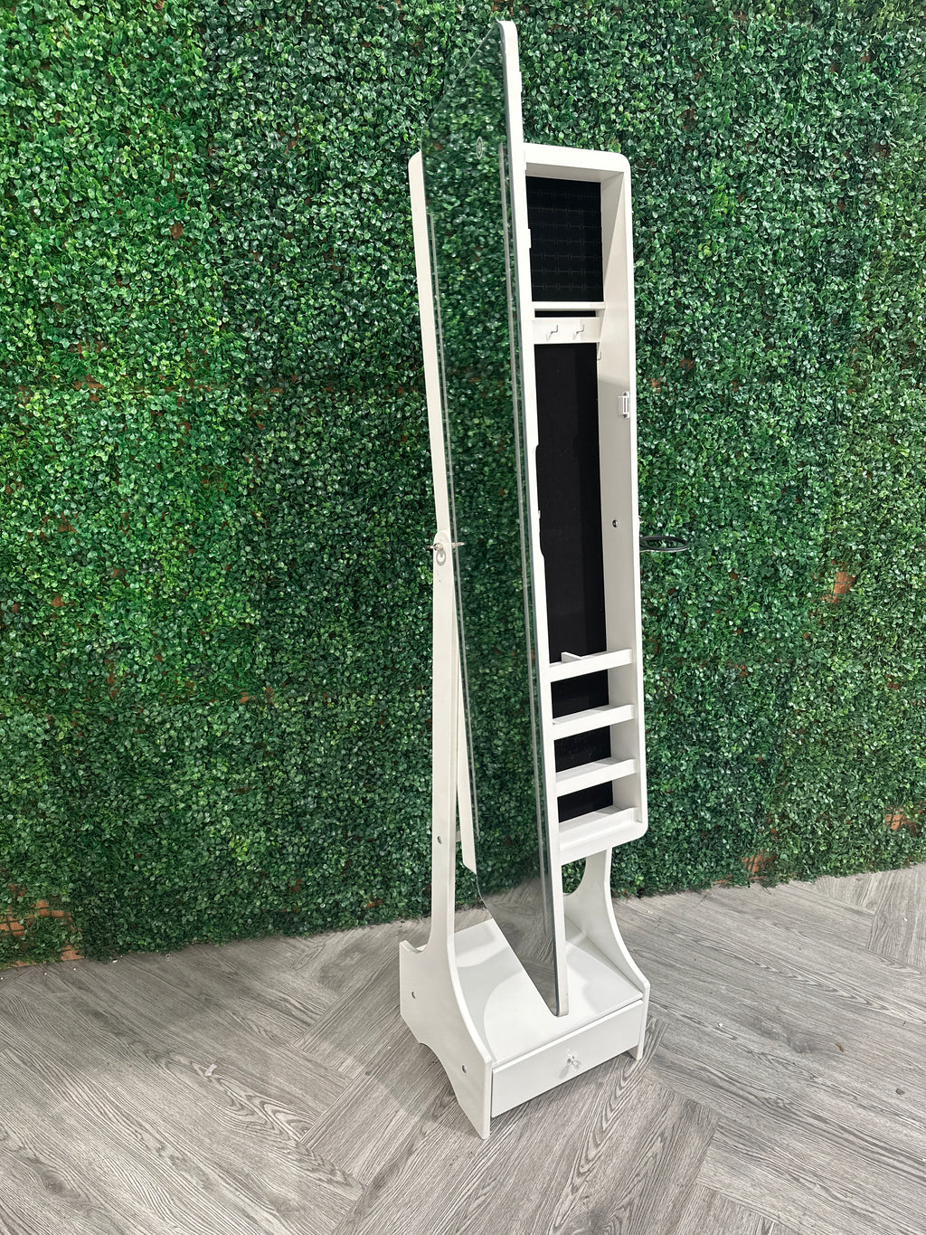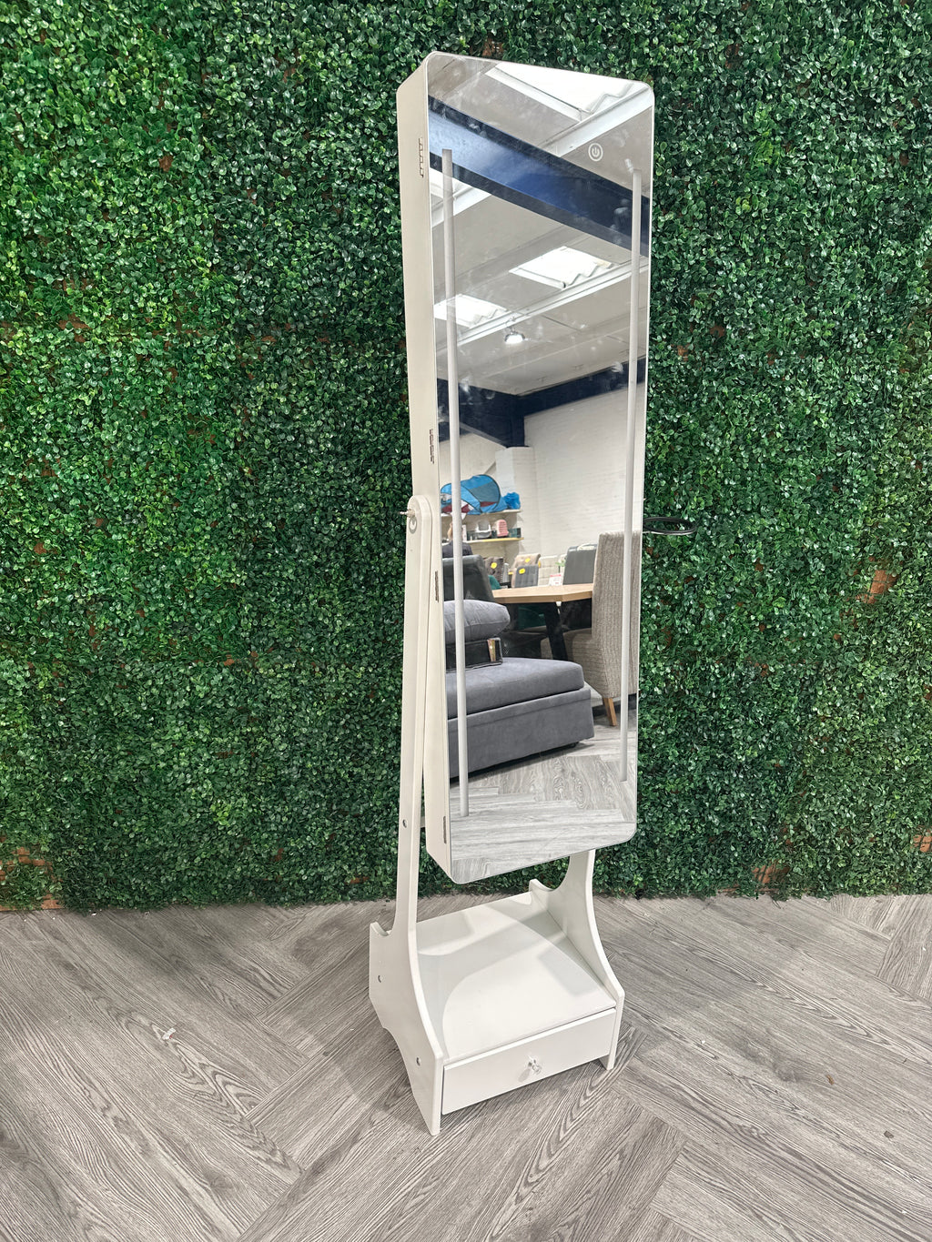 This freestanding full-length mirror is a stylish and practical addition to any bedroom or dressing area. The built-in LED lighting on both sides provides bright, clear illumination, ideal for checking makeup or outfits. With a tilting frame, you can easily adjust the mirror angle to suit your needs. A small drawer at the base provides handy storage for accessories, keeping your space neat and organised.
